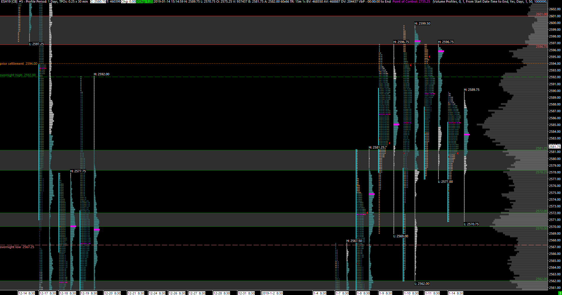 Yesterday was a balanced session overall following the initial test lower and reverse off the 2571.75 CHVN area. Volume was the lowest of the year at 1.19m and the RTH range was equal smallest at 19.00 points.